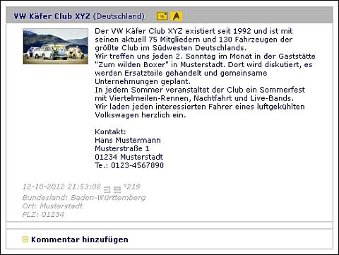 Eingetragen werden kann jeder Club, Verein oder jede sonstige regelmäßige Zusammenkunft von Besitzern oder Sympathisanten von luftgekühlten Volkswagen. Der Eintrag kann und sollte hilfreiche und möglichst richtige Informationen enthalten, damit es interessierten Seitenbesuchern möglich ist, sich über die eingetragenen Vereine und Clubs zu informieren und ggf. Kontakt zu selbigen aufzunehmen. Veraltete oder nicht mit Gewißheit richtige Mailadressen oder Telefonnummern helfen daher niemandem.